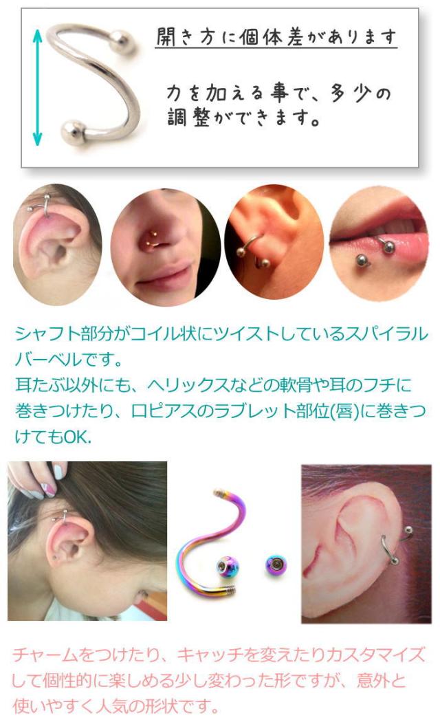 耳たぶ以外にも、へリックスなどの軟骨や耳のフチに巻きつけたり、口ピアスのラブレット部位(唇)に巻きつけてもOK.
