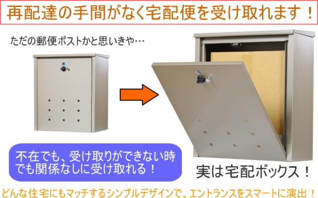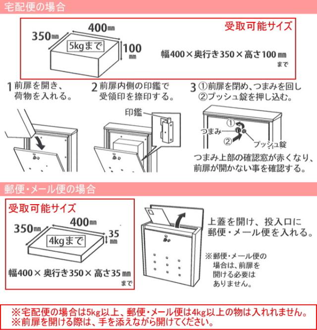 | 注意 | 宅配便の場合は5kg以上、郵便・メール便の場合は4kg以上入れることはできません。 宅配便受け取りサイズ:幅400×奥350×高100mmまで 郵便・メール便受け取りサイズ:幅400×奥350×高35mm 同梱してある木ネジはコンクリート等のかたい壁面には取り付けることはできませんので、状況に応じてホームセンター等でネジをお買い求めください。 |