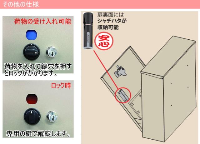 | 特徴 | これ一台で郵便、メール便、宅配便が受け取れます。 前扉裏の印鑑ケースにシャチハタを収納する事で不在時でも再配達の手間なく宅配物が受け取れます。 宅配物の有無が一目でわかる確認窓付き。 上蓋裏側に配達員にもわかりやすい操作説明シール付。 説明書生鮮食品、貴重品、現金などを受け取ることはできません。 |