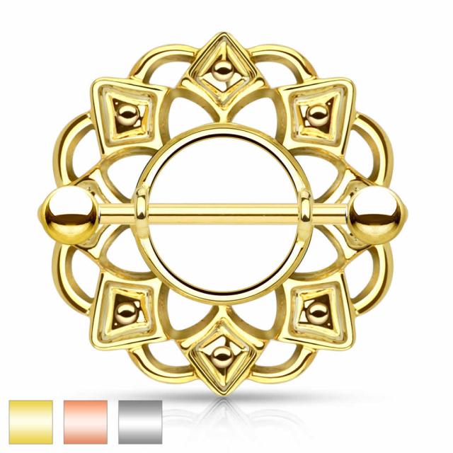 上品なトライバルデザインのニップルシールドにステンレスのストレートバーベルをセットした高級感のある乳首ボディピアス。下着感覚で楽しめるおしゃれなニップルボディピアスは、メンズでもレディースでも使えるクールなデザインが人気。プレゼントにもおすすめです。