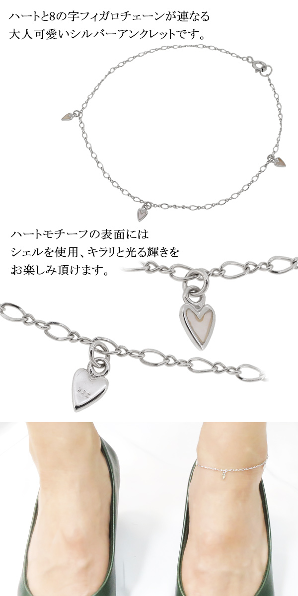 ハートと8の字フィガロチェーンが連なる大人可愛いシルバーアンクレットです。