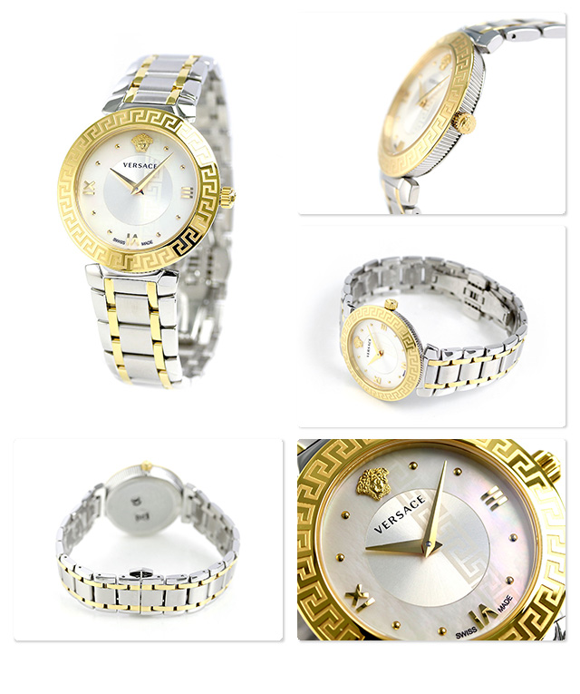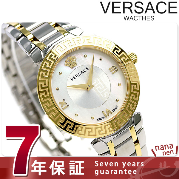 7年保証キャンペーン ヴェルサーチ ベルサーチ ヴェルサーチェ ダフニス 35mm クオーツ スイス製 レディース 腕時計 V16060017 VERSACE DAPHNIS 35mm アナログ ホワイトシェル×ゴールド ◆VERSACE(ヴェルサーチ)は、1978年にジャンニ・ヴェルサーチにより設立されたイタリアブランドです。ジャンニ亡き後、妹のドナテラ・ヴェルサーチが引き継いで先任デザイナーに就任。ヴェルサーチウォッチはすべてスイスで作られており、高品質かつ高精度さが魅力です。古典と現代の完璧なバランスをもつデザインは、幅広い世代に好まれています。 女性らしさとエレガントさが感じられるデザインが特徴のモデル。結婚式やパーティーなど華やかなシーンにおすすめです。