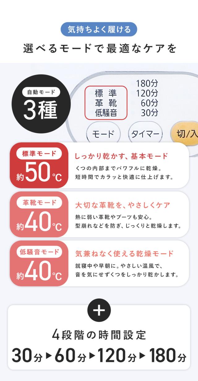 便利な3つのモード(標準・革靴・低騒音)機能付きです。