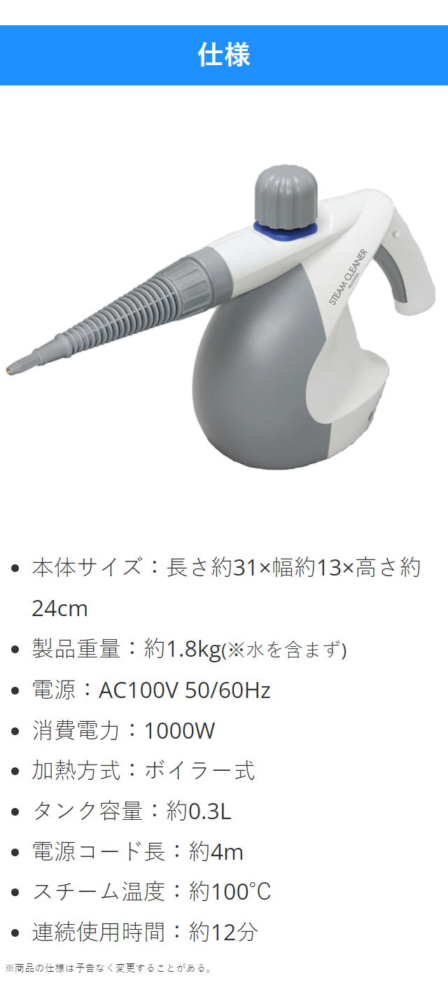 手軽に使えるハンディサイズの加圧噴射方式スチームクリーナーです。キッチン周りやサッシなど細かい箇所のお掃除に最適です。100℃のスチームを噴きつけることにより,油汚れなどを落とすことができます。また、除菌・防カビにも効果があります。タンク容量0.3リットルで最大12分間の使用が可能。安全面にも配慮したメインスイッチ、チャイルドロック、セーフティキャップで、安心・安全☆
