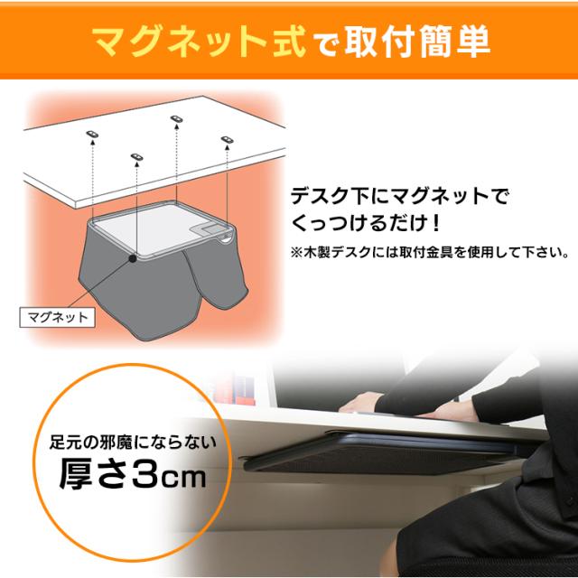 マグネットや両面テープで机の下に簡単に取り付け可能です。