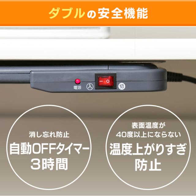 温度の上がり過ぎを防ぐ安全装置・3時間自動OFFタイマー付き。