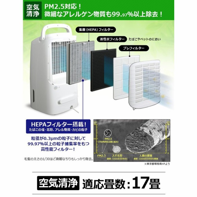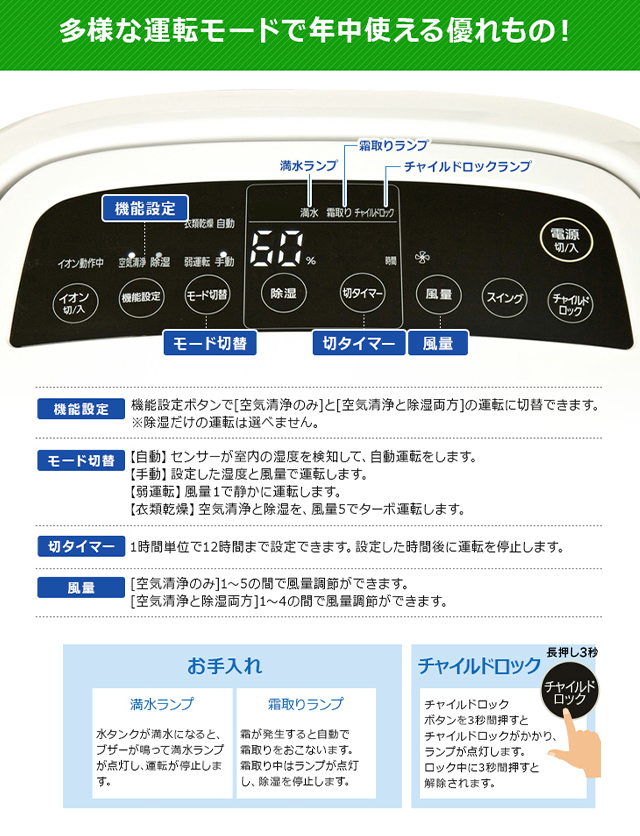 空気清浄・空気清浄+除湿の2つの機能、自動・手動・弱運転・衣類乾燥の4つのモード搭載されています。