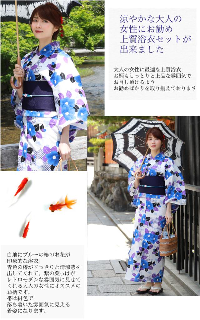 浴衣 レディース レトロ セット 大人 浴衣3点セット「白地に青の椿と紫の葉」 浴衣 椿 青