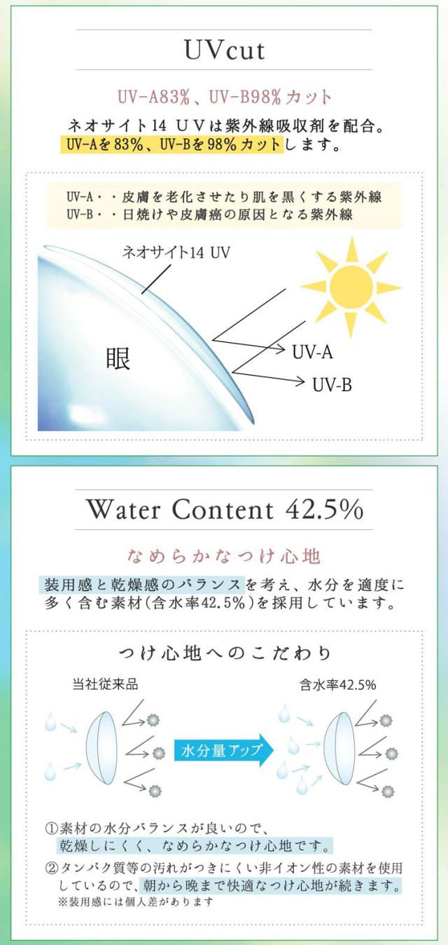 UVカット及び、うるおい成分MPCポリマーをプラスし、「ネオサイト14 UV」としてリニューアルしました!「水分をより多く含むレンズ素材(含水率42.5%)」を新たに採用し、「有害な紫外線をカットするUV吸収剤」を追加することで、装用感と安全性が大幅に向上されたレンズとなっております。