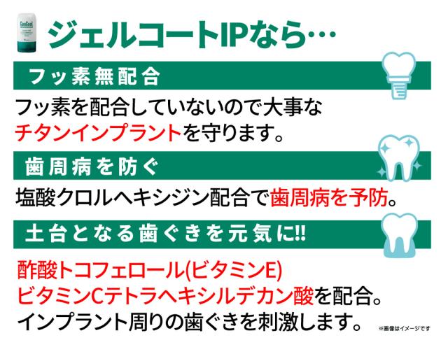 | 商品詳細 | 内容量:90g×6個 ※フッ素無配合・納得の殺菌力・歯肉刺激でインプラントを守る、インプラント用のジェル歯磨きです。 |