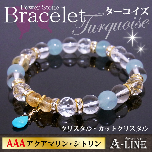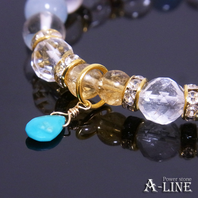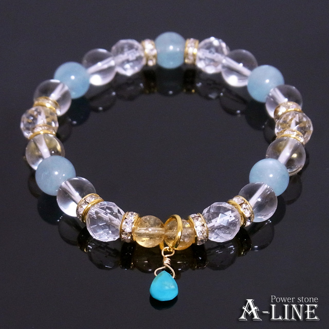ターコイズ(ワイヤー)・AAAアクアマリン8mm&64面カットクリスタル&水晶8mm・シトリン6mm・合金ロンデル・国産高級オペロンゴム