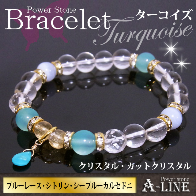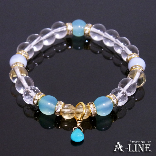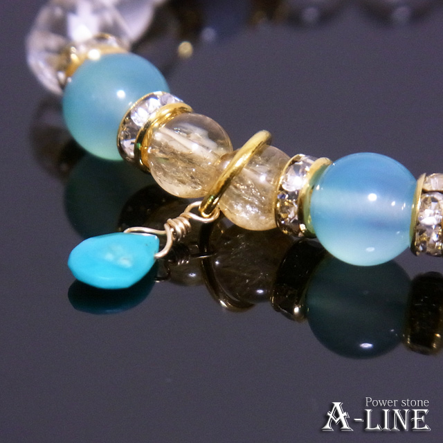 ターコイズ(ワイヤー)・シーブルーカルセドニー(染め)&ブルーレース&64面カットクリスタル&水晶8mm・シトリン6mm・合金ロンデル・国産高級オペロンゴム