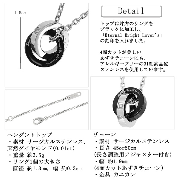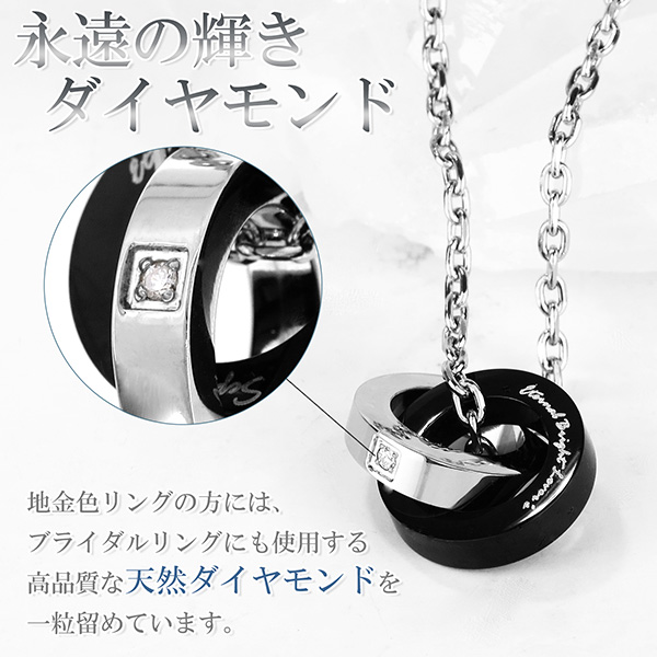 色違いの2連リングのトップにダイヤを留めた、サージカルステンレス製ネックレスです。