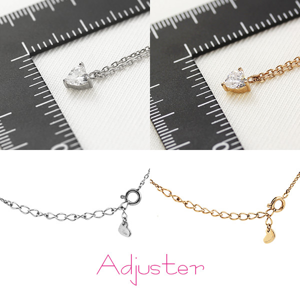 アジャスタブルチェーンにも高品位ステンレスを使用し、エンドチャームにハート型プレートが付いています。