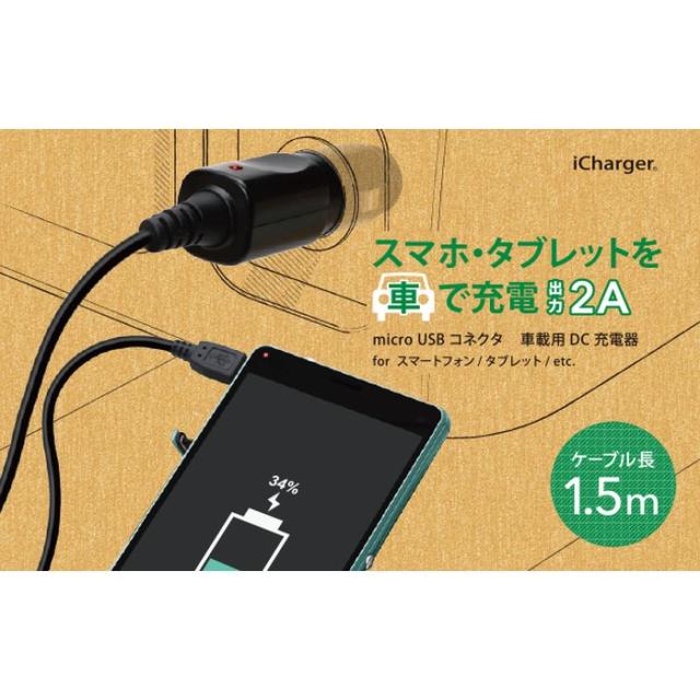 ■商品名:microUSBコネクタ搭載車載用DC充電器 出力2A ケーブル長1.5m ホワイト