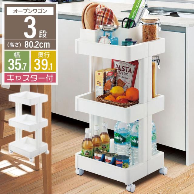 | キッチンやリビングで多用途に使える新感覚ワゴン 清潔さと便利さを兼ね備えたオープンワゴン。 一般的な4隅にパイプを通すタイプのプラスチックワゴンとは違い、2本の支柱によって支えられているデザイン。 コーナー部分に障害物がないため、開口部を広く取ることができ、多方向からも取り出しやすくなっています。 キャスター付きで移動もラクラク。 |