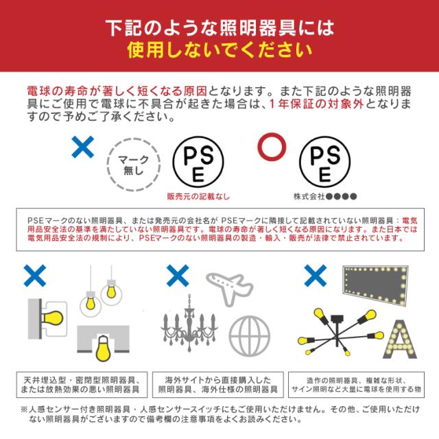 | 備考 | 【調光について】 ・位相制御式、国内のLED専用調光器をご使用ください。(PWM/DMX式、デジタル制御式、そのほか一部の調光器には対応しておりません。) ・全ての調光に対応するものではありません。またご使用の環境、調光器具との相性などによって調光しない場合があります。 ・0−100でのスムーズで完全な調光を約束するものではありません。 ・調光器の種類や使用負荷数によってはノイズやちらつきが発生することがあります。 ※自動点灯機能付器具、リモコン付の器具等では動作しない可能性がございます。 ※ 断熱材施工器具[SB、SGI、SG形表示器具]、密閉型器具には使用しないでください。(このほか使用器具の種類によって寸法的、熱的、その他の状況により使用できない場合があります。) ※位置表示灯内蔵形スイッチ(ホタルスイッチ)や消灯時でも微小電流が流れる回路でご使用になる場合、スイッチを切っても微弱点灯する場合がございます。⇒不具合がある場合は返品・返金対応いたします。 ※電球のみの販売です。その他の器具は別でお買い求めください。 ※製品の設置に関わる工事費、点灯の不具合に伴い発生する費用、二次的損害(設置納期遅延、施工費、人件費、業務に支障が生じた際の損失等)など一切の責任を負いかねますので予めご了承ください。 ※必ずお使いの配線器具(照明スイッチ)及び照明器具メーカーが指定している接続灯数・負荷容量内でご使用ください。点灯の不具合や製品の寿命が著しく短くなる原因となります。 ※LED電球は照明器具や調光器、電気経路との相性がございますので、業務用として大量に本製品を使用される場合等、全量ご購入前にお使いの環境に適用されるか一度ご確認ください。 |