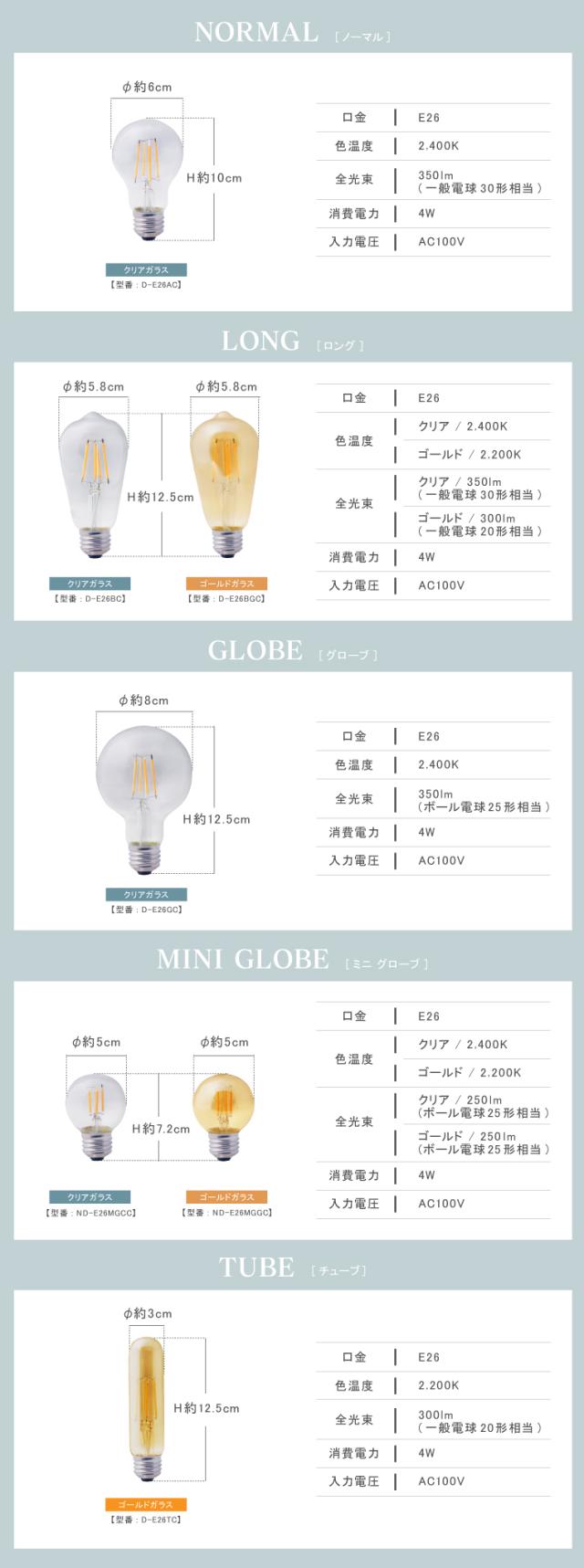 | サイズ | [E26 ノーマルクリア] 約 Φ6.0cm×縦10cm [E26 ロングクリア/ゴールド] 約 Φ5.8cm×縦12.5cm [E26 GLOBEクリア] 約 Φ8cm×縦12.5cm [E26 ミニGLOBEクリア/ゴールド] 約 Φ5cm、縦7.2cm [E26 チューブゴールド] 約 Φ3m×縦12.5cm |