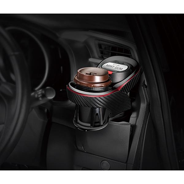 純正カップホルダーを活用してカップホルダーを増設できる。4点支持でドリンクをホールド。
