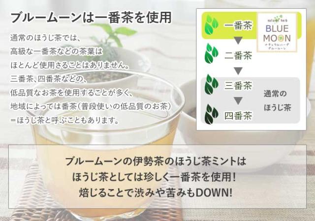 三重県特産の伊勢茶の新茶(一番茶)で作られた「ほうじ茶」×スッキリとした味わいでおなじみのハーブティー「ペパーミント」この2つのお茶をブレンドして、夏でもすっきりと飲みやすいブルームーンだけのオリジナルブレンドティーが完成しました。