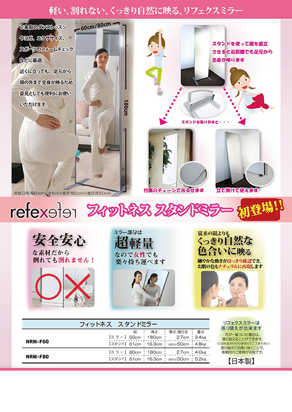 プロ仕様!割れない鏡 【REFEX】リフェクス フィットネス スタンドミラー 大型姿見 NRM-F60 ミラー:W60cm×180cm×2.7cm スタンド:W61cm×H16.3cm×L50cm 飾縁:W1.5cm シルバー【日本製】【送料無料】(代引不可)