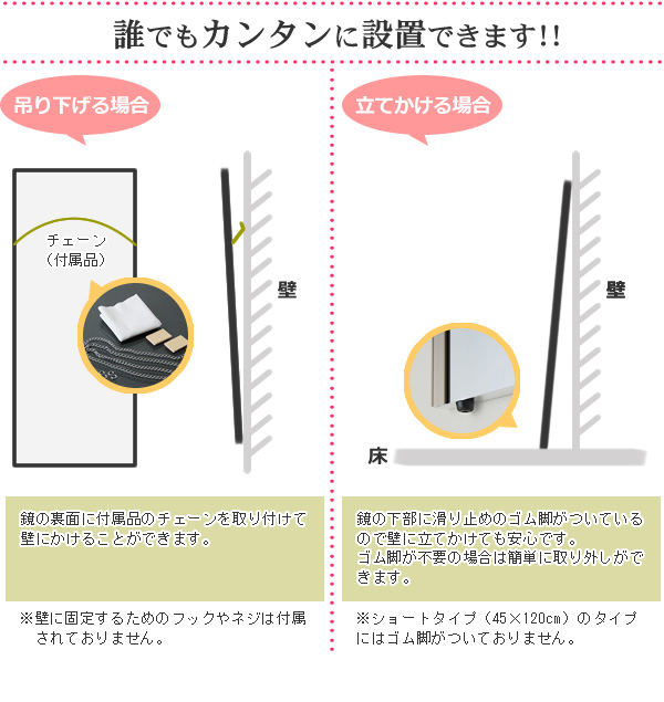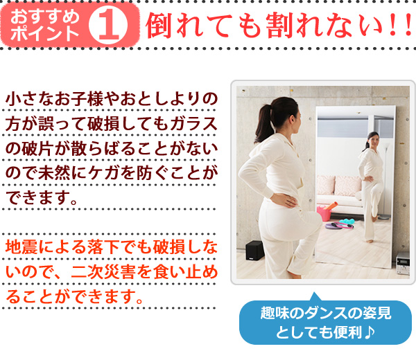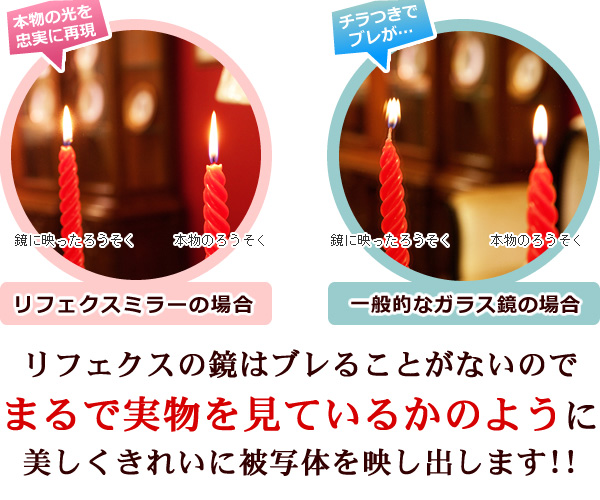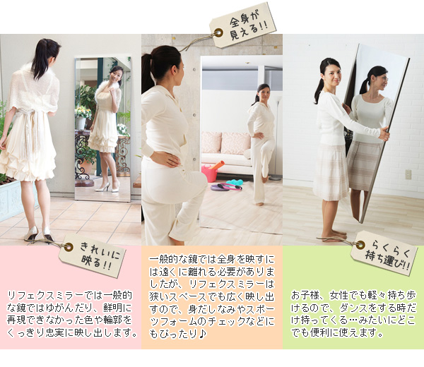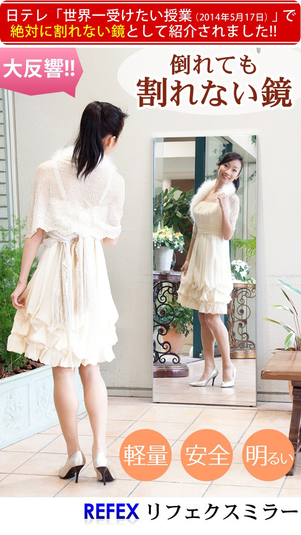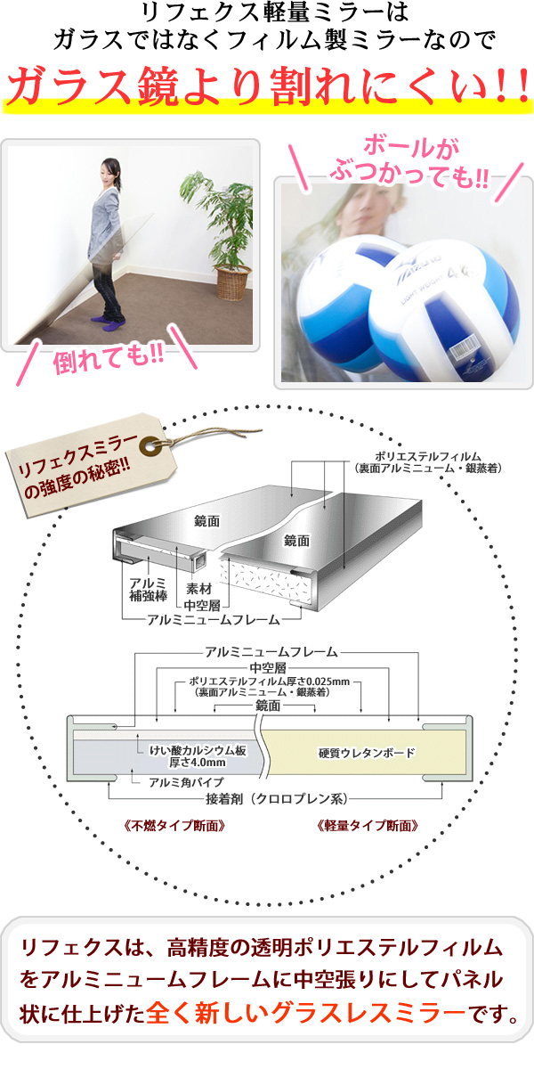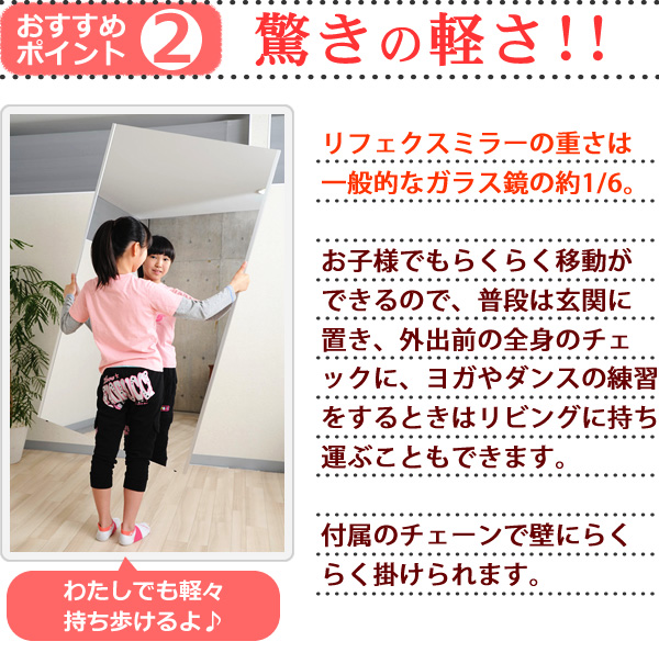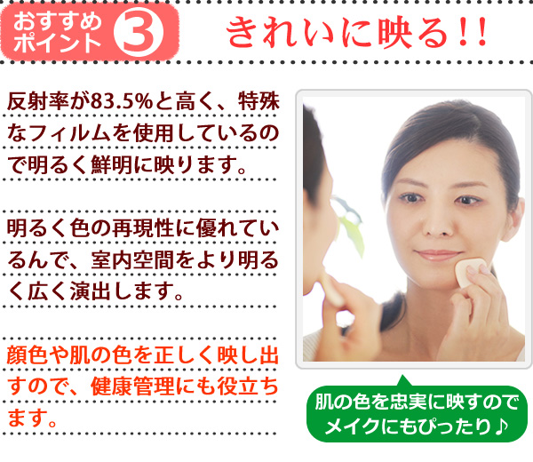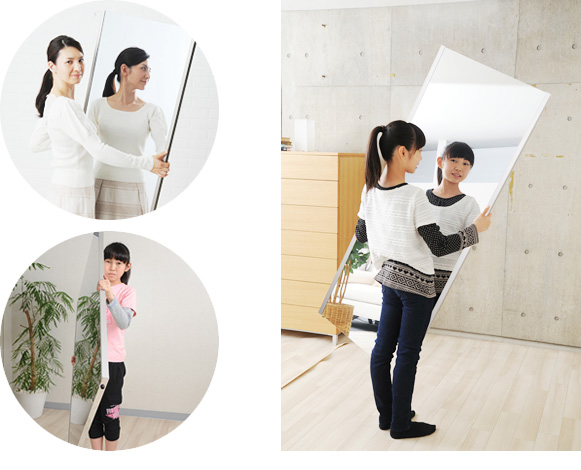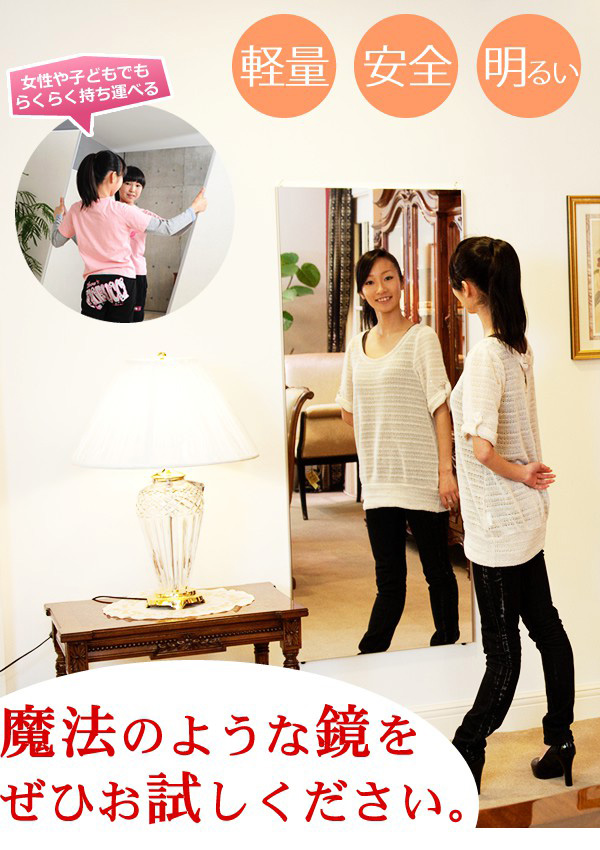軽量です。市販のフックで簡単に壁に吊下げられます。女性や高齢の方でも手軽に部屋から部屋へ移動が出来ます。硝子ではなくフィルムですので落下したり衝撃を受けても割れたり飛散したりしないので安全です。厚みで映像がダブってしまうガラス鏡に比べ極薄(0.025mm)のフィルムで像を反射するのでゴーストが無く鮮明にくっきりと映し出します。高透明なフィルムを使用していますので肌の色が自然に映ります。反射率が83%と高く鮮明に映し出します。