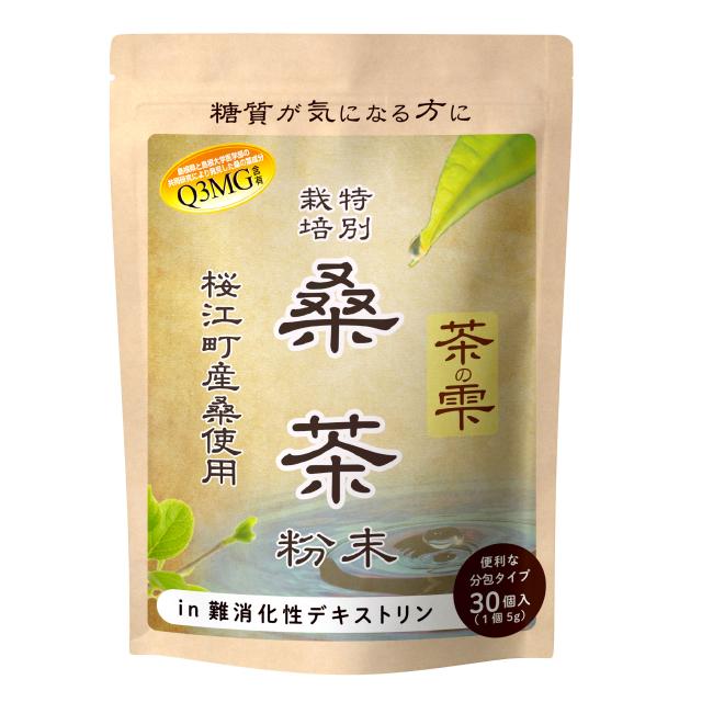 「Q3MG」たっぷり含有の島根県桜江町産桑を丸ごとパウダーにしたものとトクホで話題の食物繊維『難消化性デキストリン』をバランスよく配合。二つの糖質対策成分が毎日の食生活をお助けします。