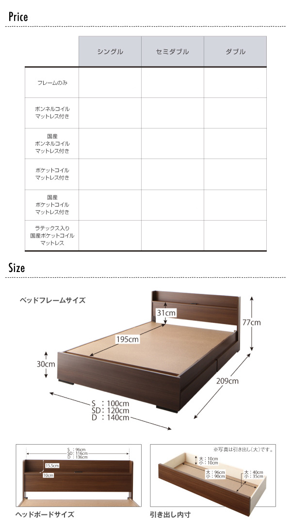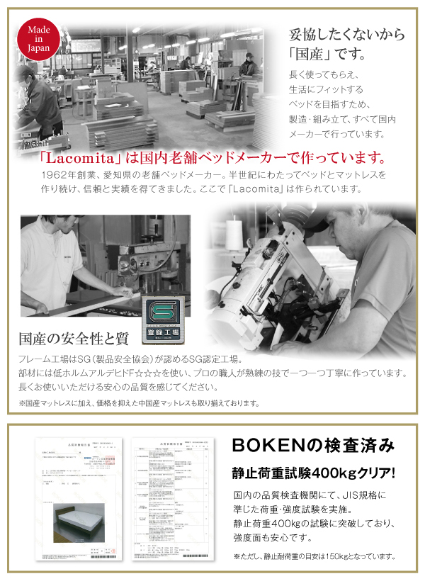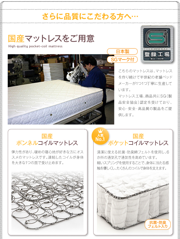 ※ベッドのフレームはスプリングマットレス使用時の基準で強度計算されております。