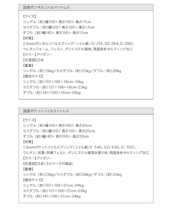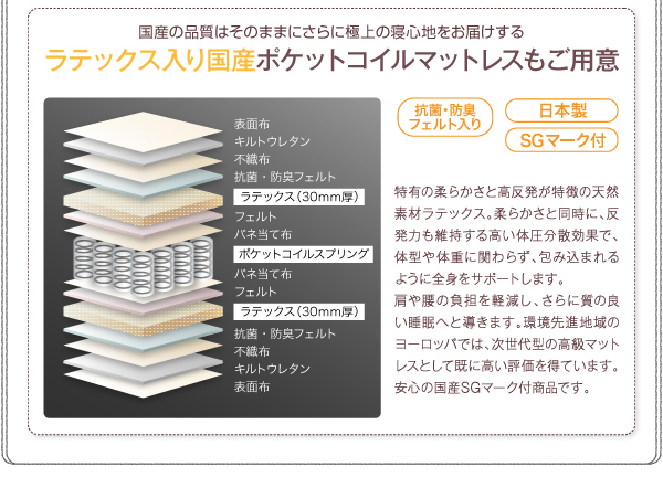 2.1mmボンネルコイルスプリング(コイル数/ S:270 SD:330 D:390)、2.2mmポケットコイルスプリング(コイル数/ S:92 SD:98 D:104)、ウレタン、フェルト、ポリエステル張地、両面多針キルティング加工