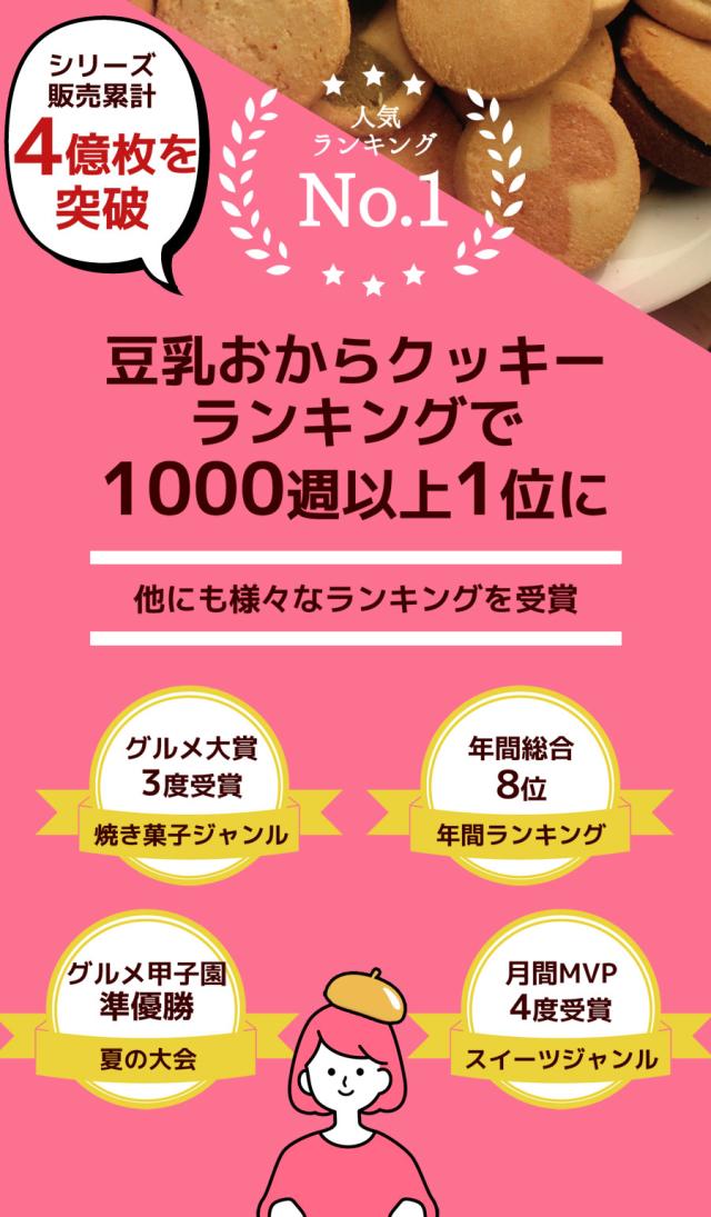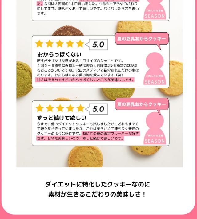 春夏限定のスペシャルフレーバーは美味しさとサクサク感が違います!楽天市場で一番人気の大人気の豆乳おからクッキーに春夏限定のスペシャルバージョンが登場!伝説のシェフと、厳選されたホンモノ素材とのコラボレーション!!まるでスイーツショップのクッキーのような美味しさ♪豆乳、おからに加え話題の食物繊維イヌリン、グルコマンナン配合でさらにツマリスッキリ!満腹感だってUPしちゃいました。まるでケーキ屋さんのクッキーのような美味しさ♪サクサク豆乳おからクッキーを1食5〜8枚での置き換えで目指せおいしくダイエット!