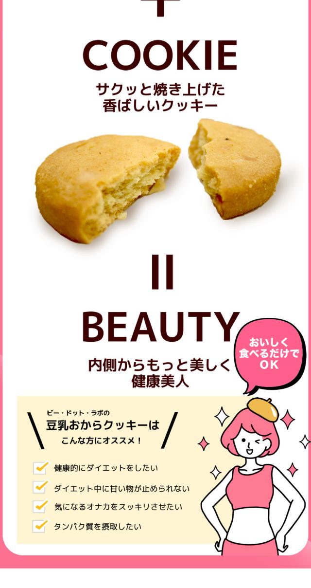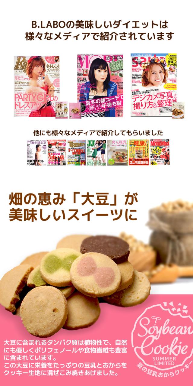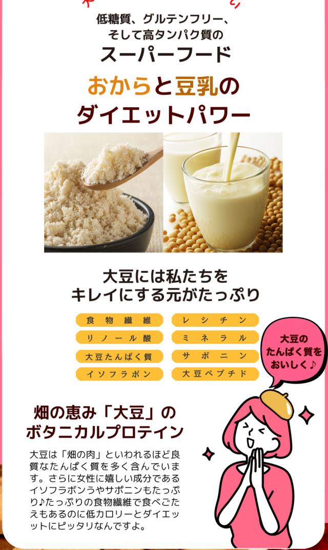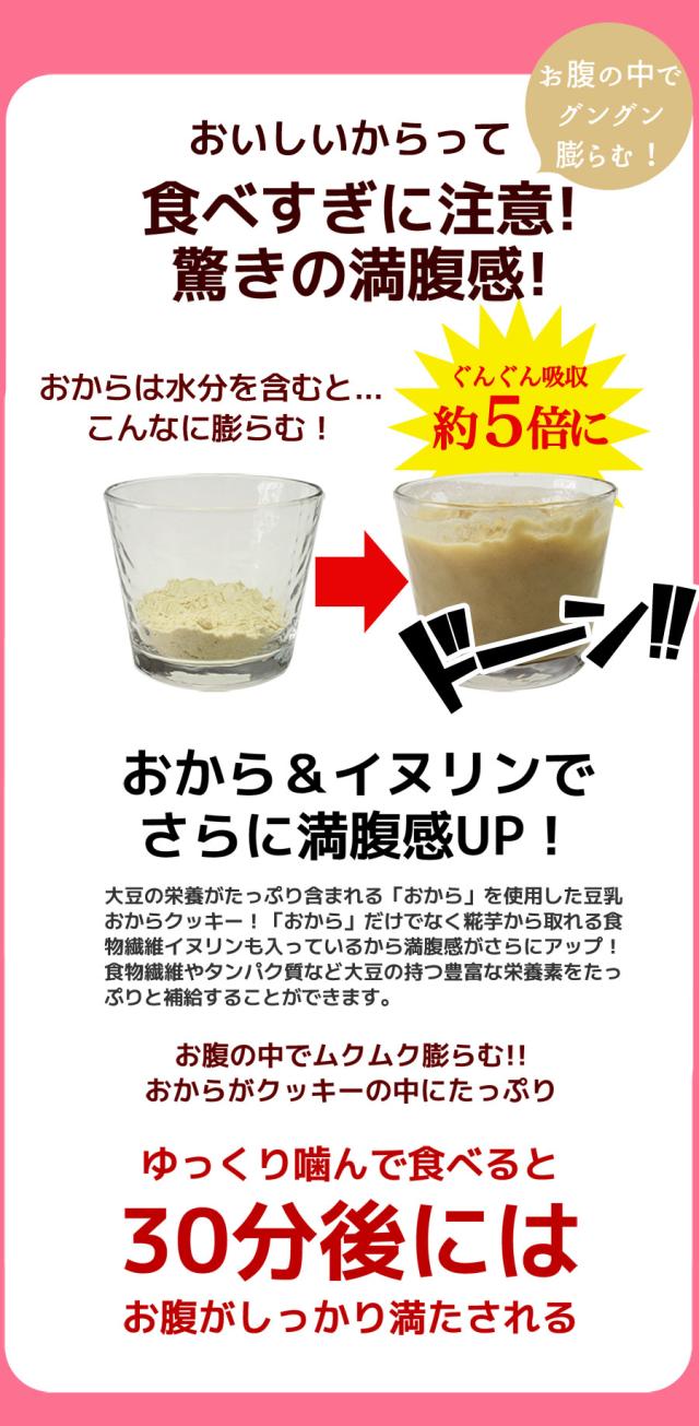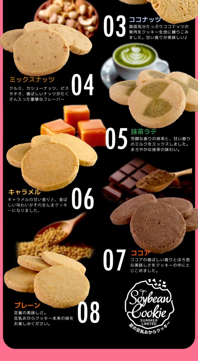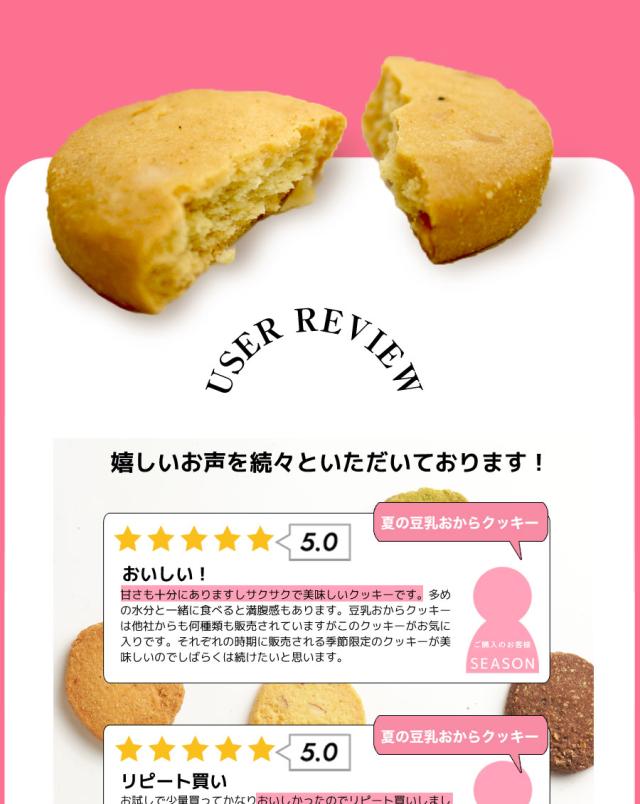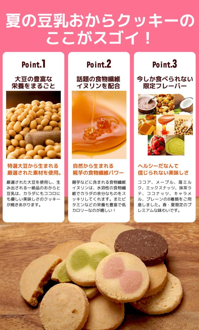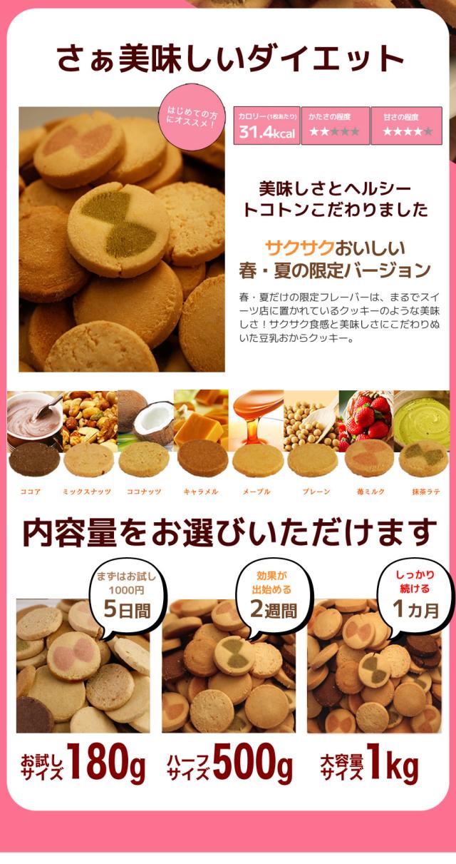 春夏限定のスペシャルフレーバーは美味しさとサクサク感が違います!人気の大人気の豆乳おからクッキーに春夏限定のスペシャルバージョンが登場!伝説のシェフと、厳選されたホンモノ素材とのコラボレーション!!まるでスイーツショップのクッキーのような美味しさ♪豆乳、おからに加え話題の食物繊維イヌリン、グルコマンナン配合でさらにツマリスッキリ!満腹感だってUPしちゃいました。まるでケーキ屋さんのクッキーのような美味しさ♪サクサク豆乳おからクッキーを1食5〜8枚での置き換えで目指せおいしくダイエット!