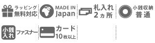 | 備考 | 【メイン開閉】ラウンドファスナー 内側/ ファスナー小銭入れx1 札入れx2 カードポケットx12 フリーポケットx4 | ||