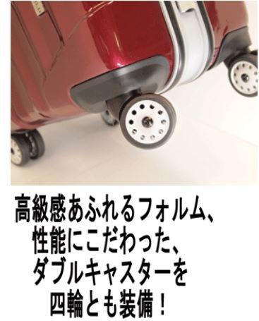 カーブや方向転換を自由自在にしてくれます; ◎一つのキャスターに、二つの車輪があることで、より重量分散になり、 重心を低くさせ、安定します; ◎騒音対策設計で、スーツケースを引く時のいやな音から解放します; ◎空港のチェックインなど、長い行列で順番待ちの時、 四輪が装備されていますので、スペースのない行列の中で、 一々スーツケースを傾いて引く必要がなく、上にカバンなどの荷物を載せたままで、 前に押し進めます。 それらの機能をすべて満足してくれるのは、 四輪とも、高性能ダブルキャスター装備のスーツケースです。 | |