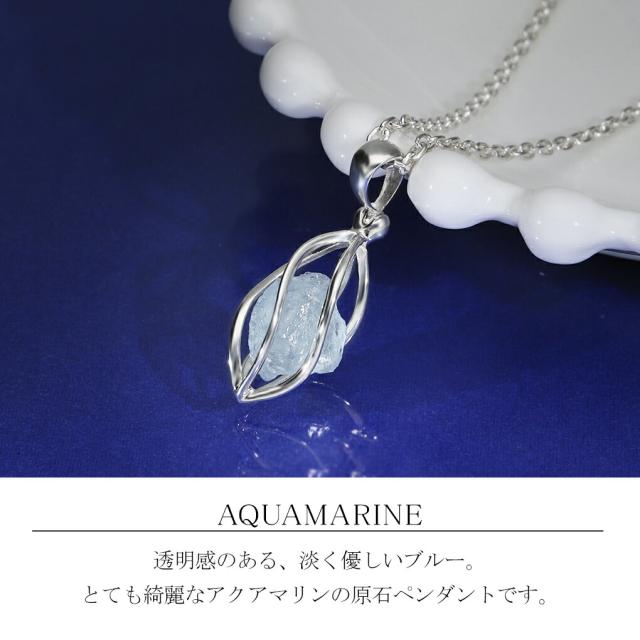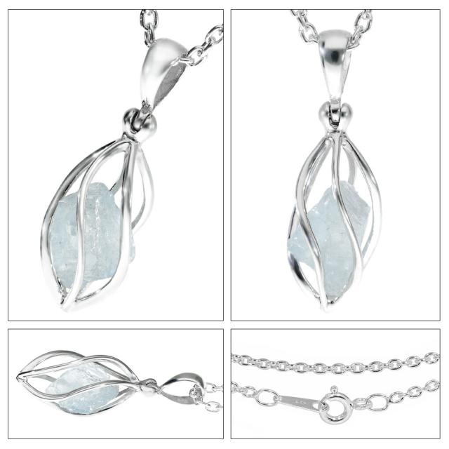 シルバー製のかごに、アクアマリンの原石を閉じ込めたネックレスです。