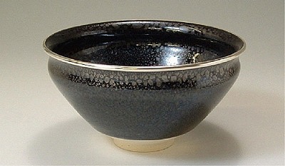 中国伝来の名品、天目茶碗の写しです。その油滴の素晴らしさに心が引き込まれそうです。覆輪加工で更に格が上がっています。