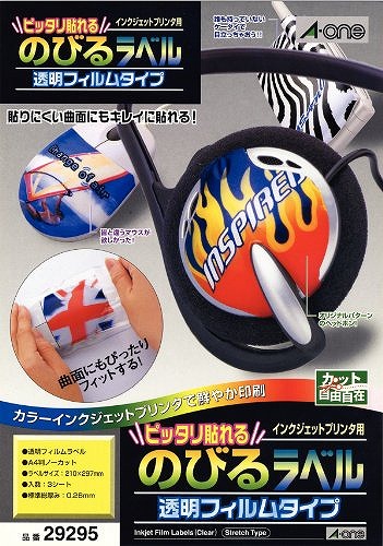 ピッタリ貼れるのびるラベル 透明フィルムタイプ/材質:ポリプロピレン+ポリスチレン/標準総厚み:0,26mm/ラベル厚み:0.141mm