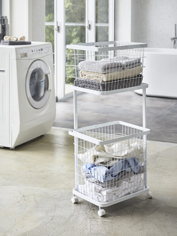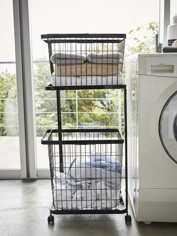 ワイヤーバスケットが2台置けるランドリーワゴンです。キャスターが付いているので、移動もラクラク。コーナーが開いたデザインになっているので、縦置き・横置きでもランドリーバスケットが取り出しやすくなっています。