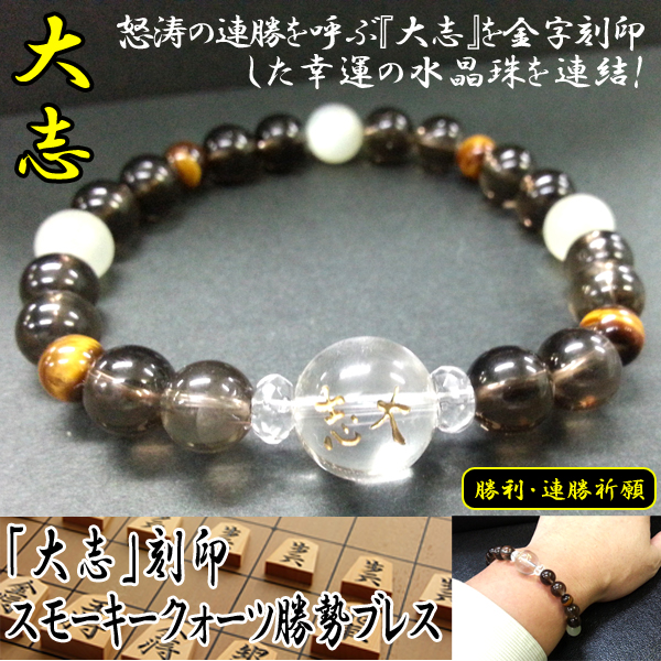 「大志」刻印 スモーキークォーツ勝勢ブレス (パワーストーンブレス,数珠,将棋,連勝,金運,勝利,虎目石,タイガーアイ,天然石)