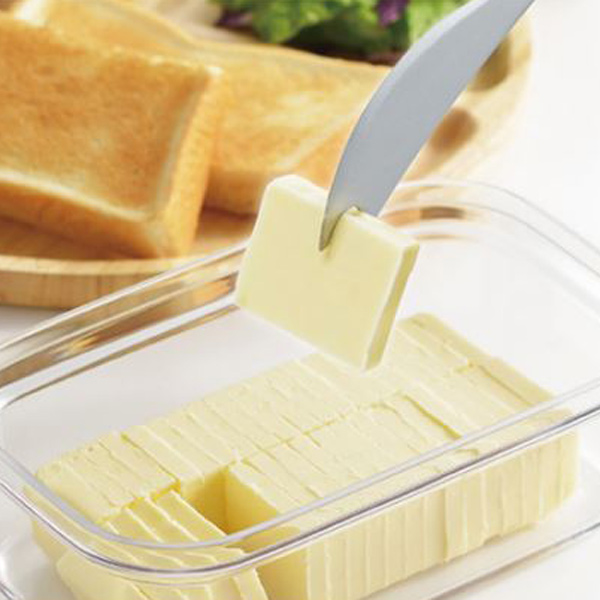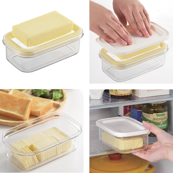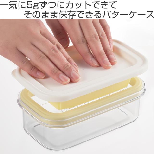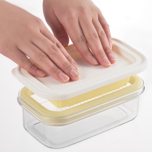 ワイヤープレートにバターを置いてフタでギューっと押すだけなので、手を汚さずにバターをうす切りにカットできます。ピタッと閉まるフタ付きなので、そのまま冷蔵庫で保存ができます。