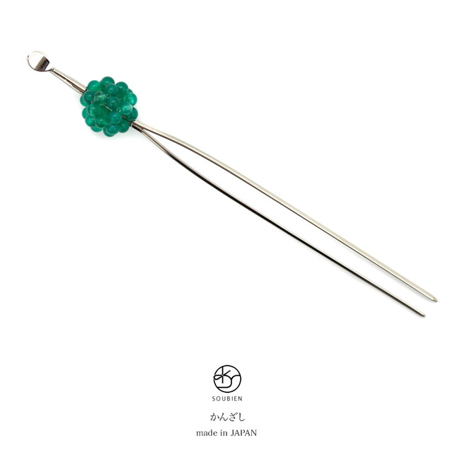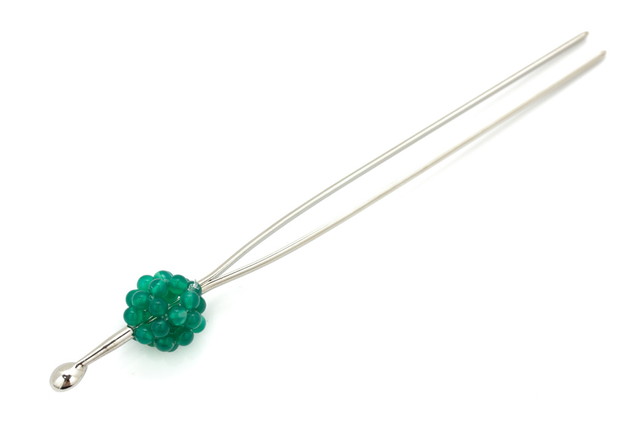 玉簪 かんざし 緑色 グリーン 銀色 シルバー 天然石 ビーズ シンプル 二本足 髪飾り 和洋兼用 浴衣向け 小紋向け カジュアル ヘアアクセサリー 和装