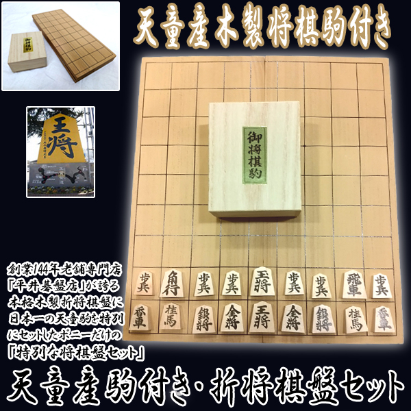 天童産駒付き・折将棋盤セット (折れ将棋盤,折りたたみ6号,山形県天童産木製将棋駒,将棋入門,携帯将棋,国産,手作り)