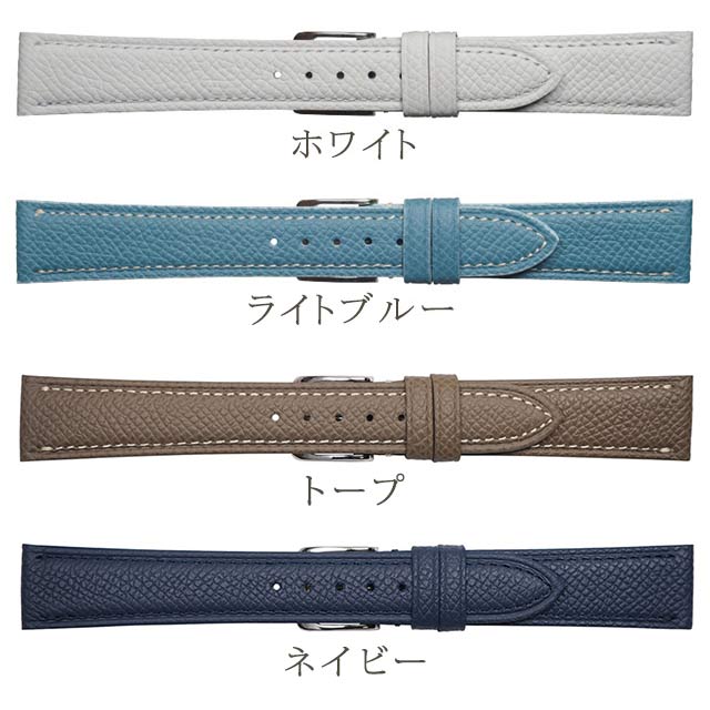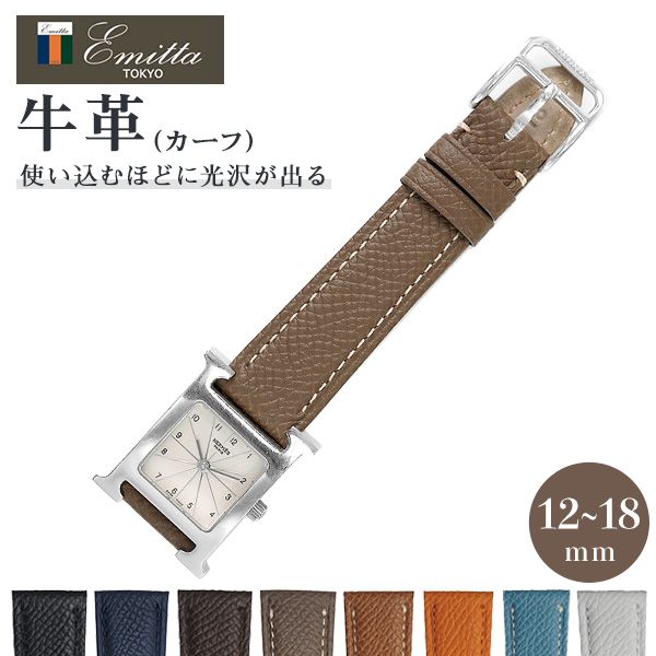 正規品 ミモザ エミッタ ワープロラックス 12mm 14mm 16mm 18mm 交換用ベルト 替えベルト カーフレザー 革ベルト 腕時計 WAPROLUX MIMOZA Emitta 選べるモデル ◆Emitta(エミッタ)は、アパレルを意識した素材感優先で「革」を厳選した、スタイリッシュさを追求するブランドです。デメリットとされていたエイジング(使い込むことによって色や質感が変化すること)こそ、良質の革の証であり、最大の魅力だと考えています。 ドイツのタンナー「ワインハイム社」の革を使用したベルトです。ほどよい柔らかさとほどよい目の大きさがエルメスレザーを彷彿とさせる、本格レザーです。Hウォッチやクリッパーなどのエルメスウォッチの替えベルトとして、おすすめです。エイジングはしにくいですが、傷や色落ちにも強いのが特徴です。使い込むと上質な光沢を帯びてきます。 ※サイズやカラー間違いにご注意くださいませ。 (カラー: ブラック ダークブラウン ブラウン オレンジ ホワイト ライトブルー トープ ネイビー )