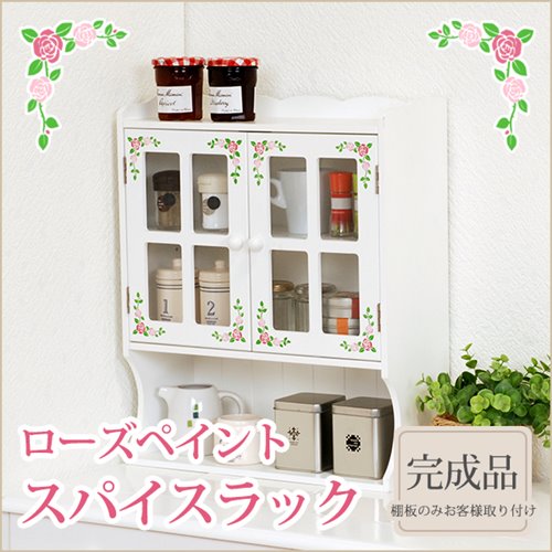 調味料ラック カウンター上収納 木製 3段 2扉 幅42cm ローズ柄 薔薇 ホワイト 白 スパイスラック