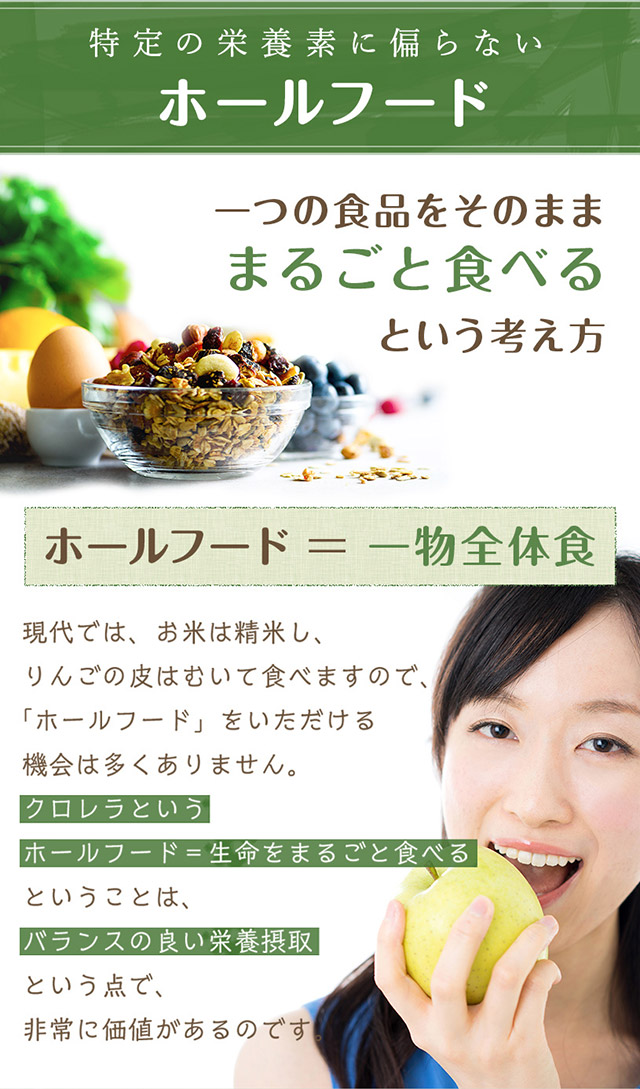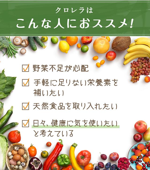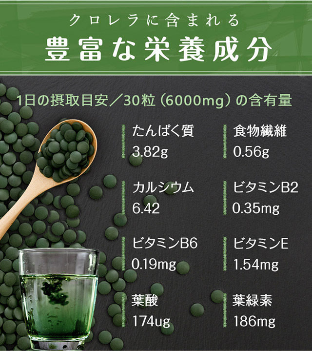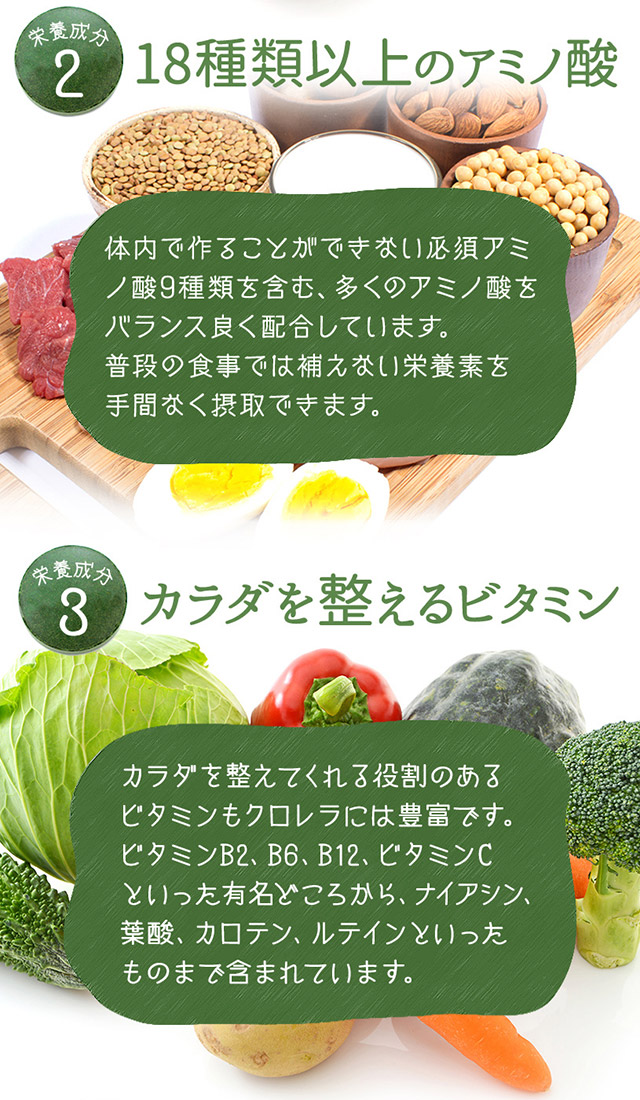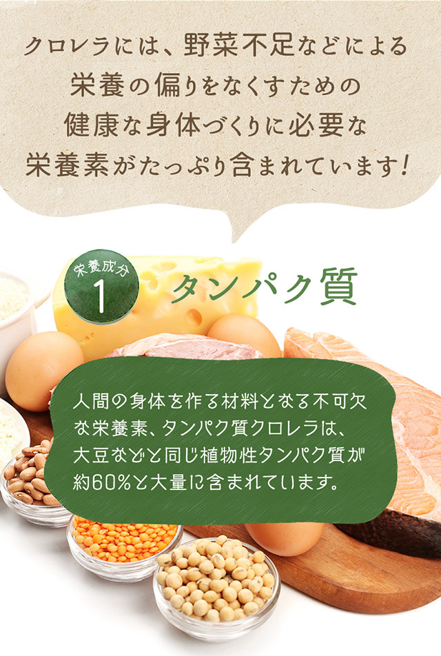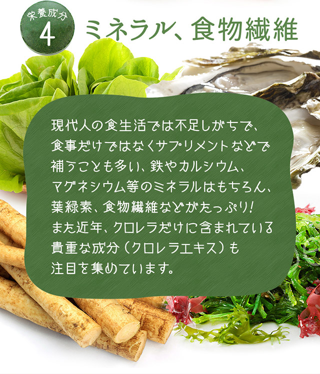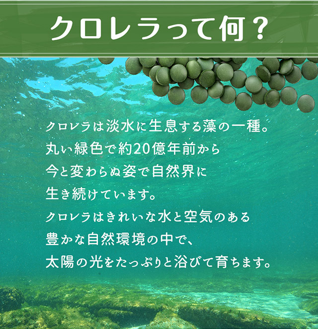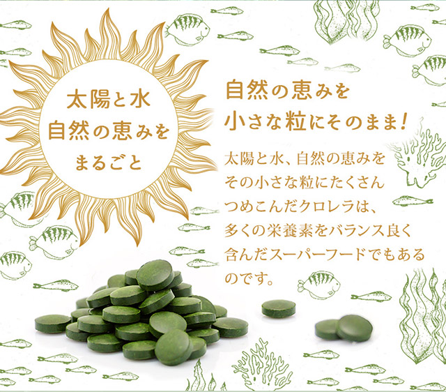 クロレラには、たんぱく質、ビタミン、ミネラル、食物繊維、葉緑素などの多くの栄養素が含まれています。そのことからスーパーフードとして注目されています。バランスの良い食事や運動を心がけ、毎日の生活サポートにお役立て下さい。
