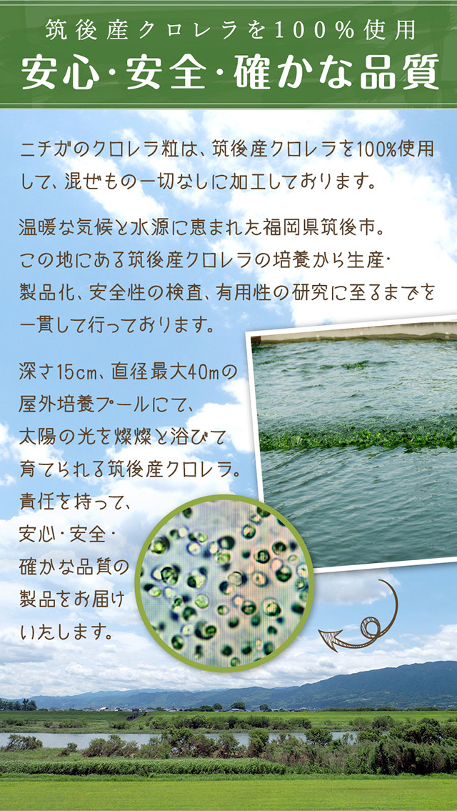 | 純国産クロレラ100%粒(日本) | クロレラ粉末100% | 福岡県筑後市 |