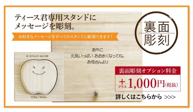 ■メッセージ・お名前を裏面彫刻!→ 裏面彫刻オプション ■ティース君を立てて飾りたい!(一人用)→ シングルスタンド・アニマル ■ティース君を立てて飾りたい!→ 手形足形入り・メモリアルスタンド ■ティース君を立てて飾りたい!(二人用)→ツインスタンド |