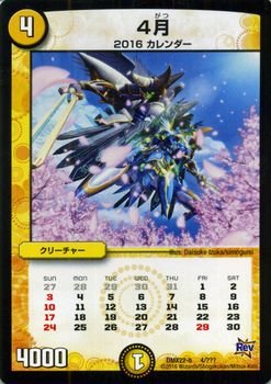 カード名:4月 カードの種類:クリーチャー 文明:光 ●レアリティ:- ●パワー:4000 ●コスト:4 マナ ●マナ:1 ●種族:2016カレンダー ★特殊能力 ★フレーバー