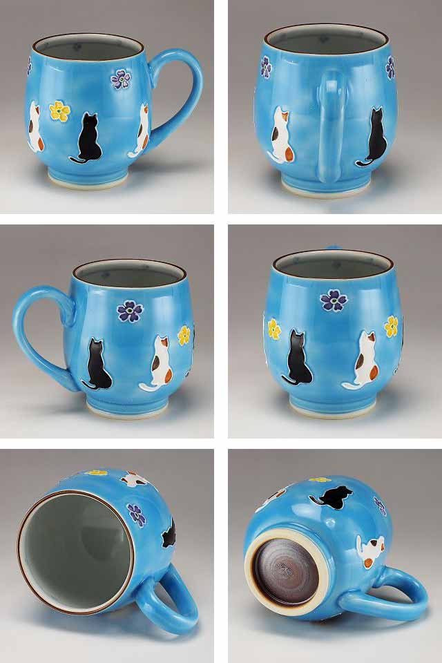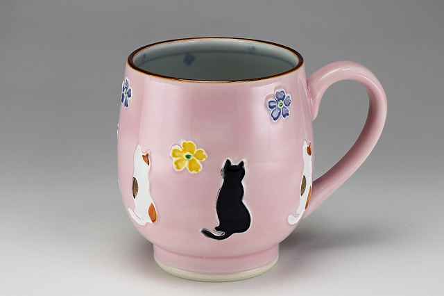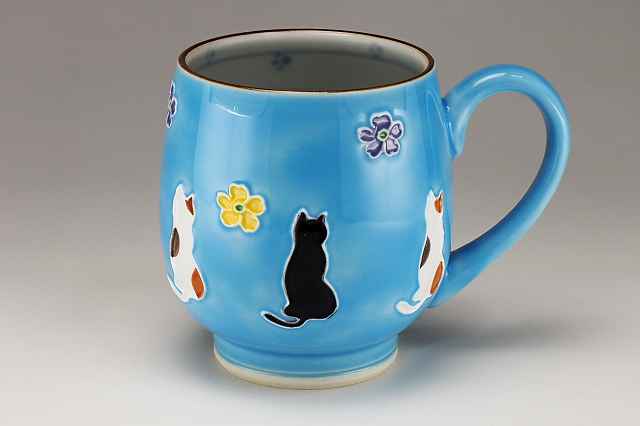 交趾釉の青とピンクの対比が美しいペアのマグです。プチと黒の猫の後姿がいとおしく感じられます。