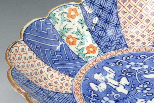 菊型の形状に染付と色絵が鮮やかに映える器です。見込には可愛い唐子か遊ぶ様子が描かれています。