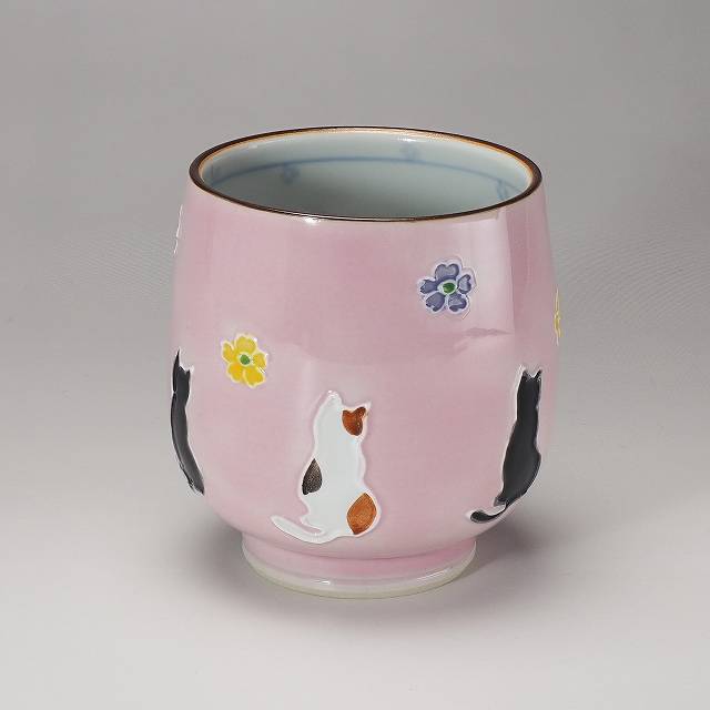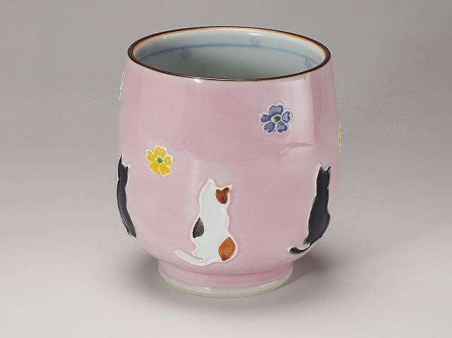 【送料無料】 京焼 清水焼 単品湯呑 小・ピンク 交趾花ねこ
